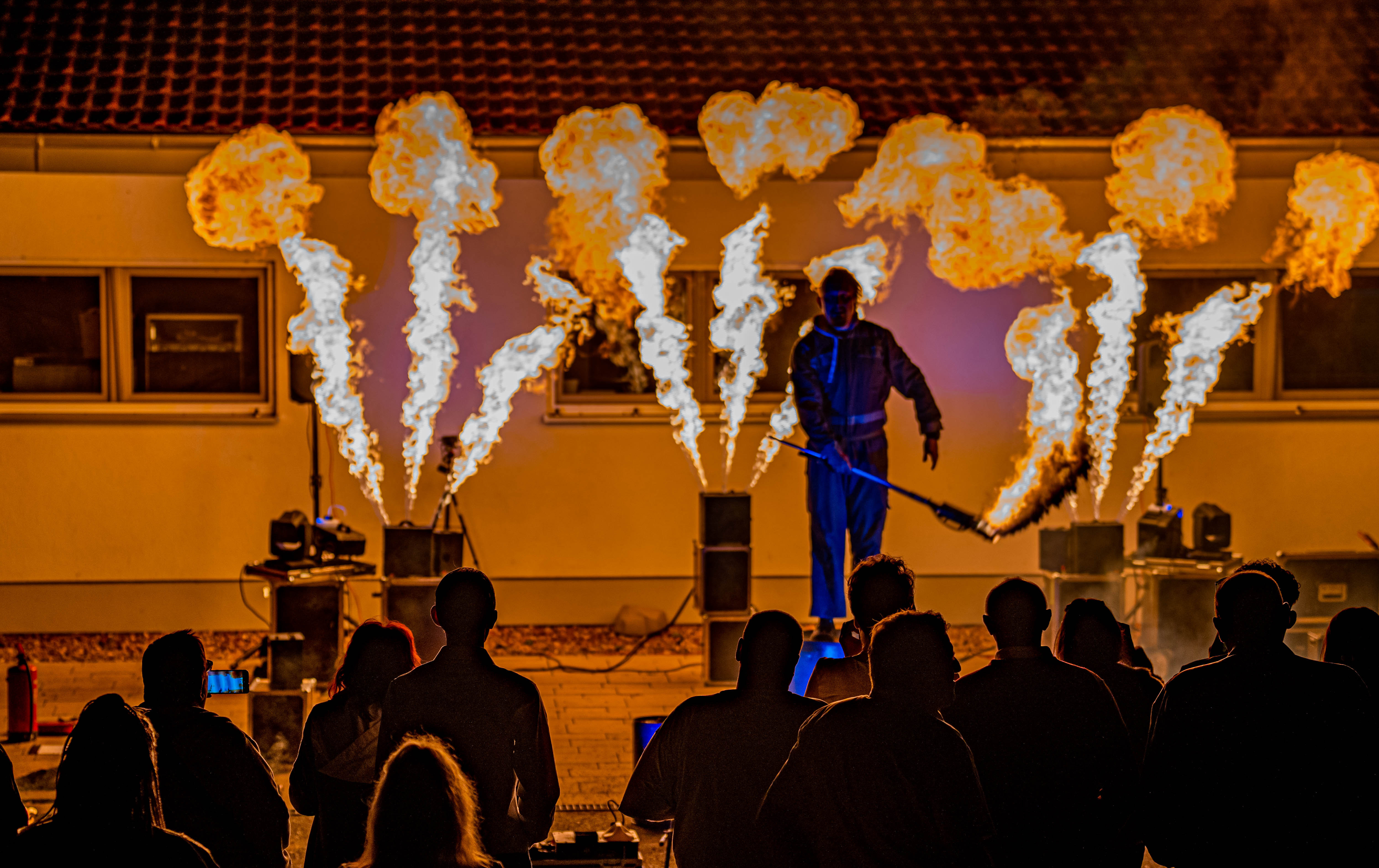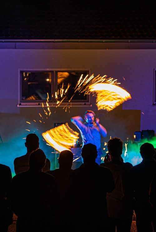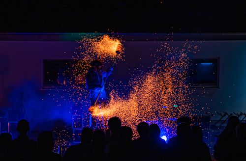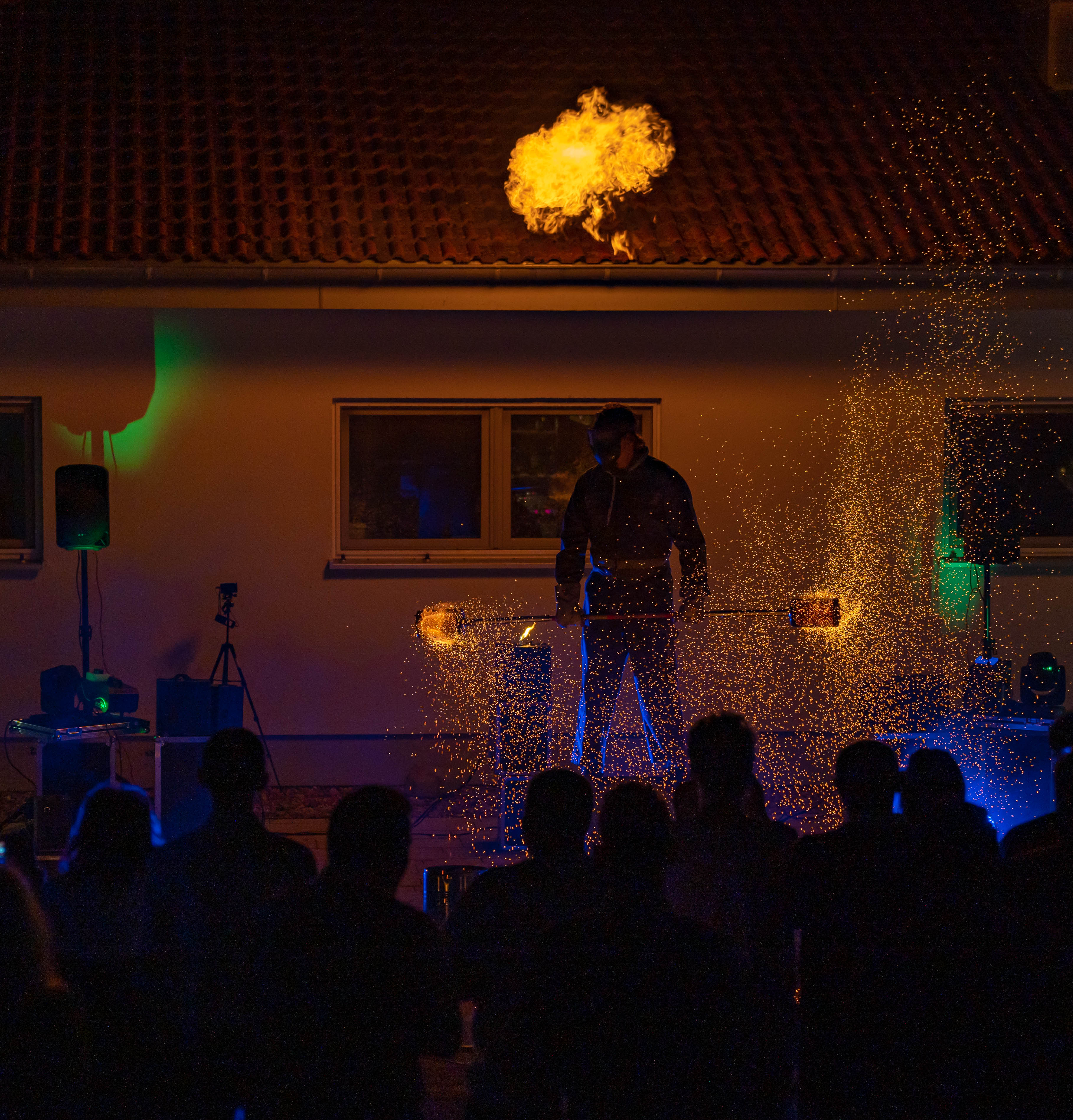 Für die exklusive Firmenfeier von Kühne + Nagel in Niedernberg durfte ich meine Show Industrial Fire präsentieren – eine Feuershow voller Energie, Präzision und Emotion. Auf dem weitläufigen Gelände des Golfplatzes entstand eine Bühne aus Licht, Flammen und Funken. Brennende Fässer verwandelten sich in rhythmische Instrumente, Funkenstürme erhellten die Nacht, und pulsierende Beats verbanden Feuer, Klang und Bewegung zu einem eindrucksvollen Erlebnis.