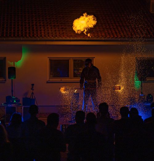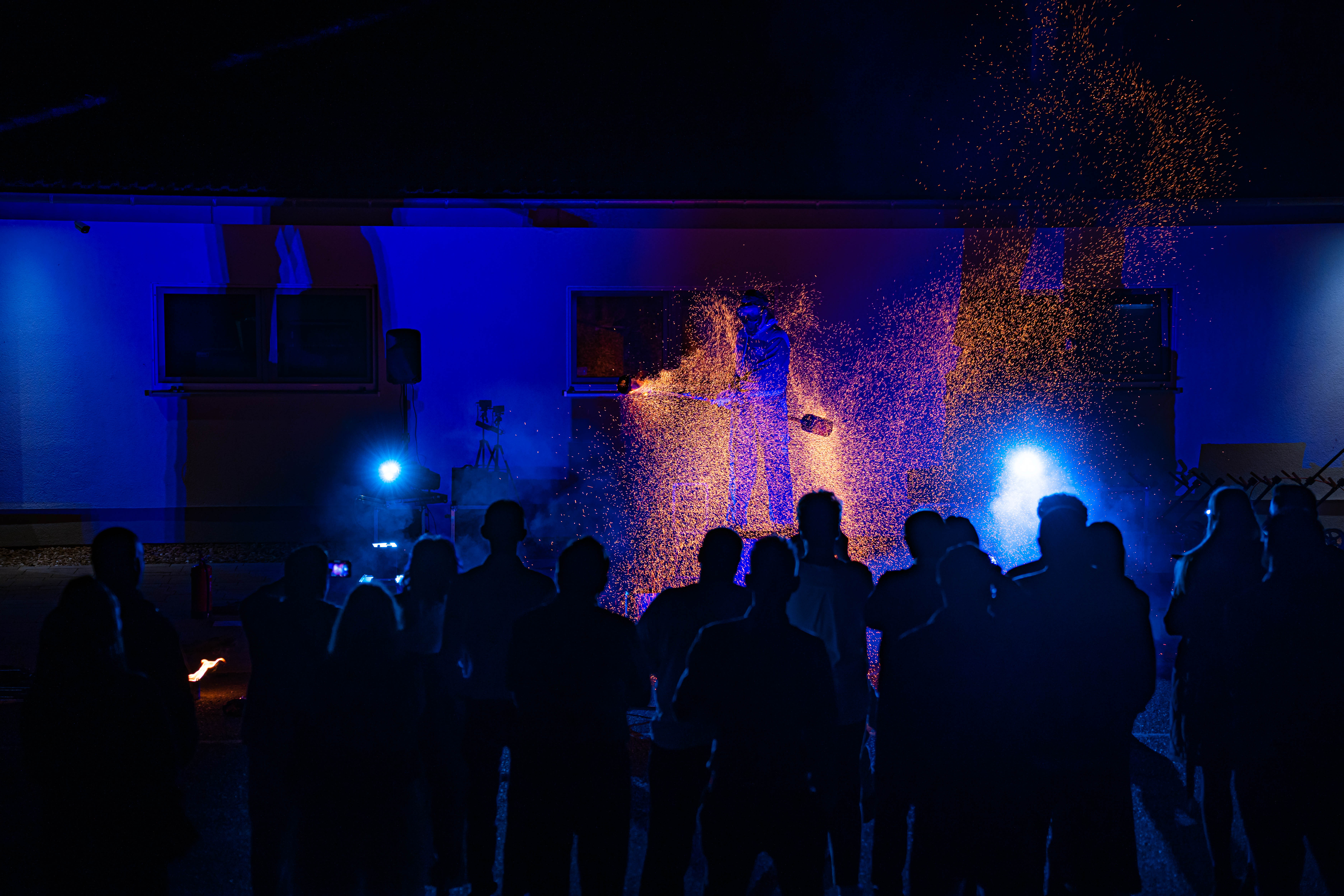 Besonders herausfordernd war die sensible Location: Der Untergrund musste trotz intensiver Effekte sauber und unversehrt bleiben. Durch sorgfältige Planung, speziell abgestimmte Materialien und eine gründliche Nachbereitung mit Industriestaubsauger konnte ich garantieren, dass nach dem letzten Funken kein Rückstand blieb. So stand der beeindruckenden Show nichts im Wege – sicher, kontrolliert und professionell umgesetzt.