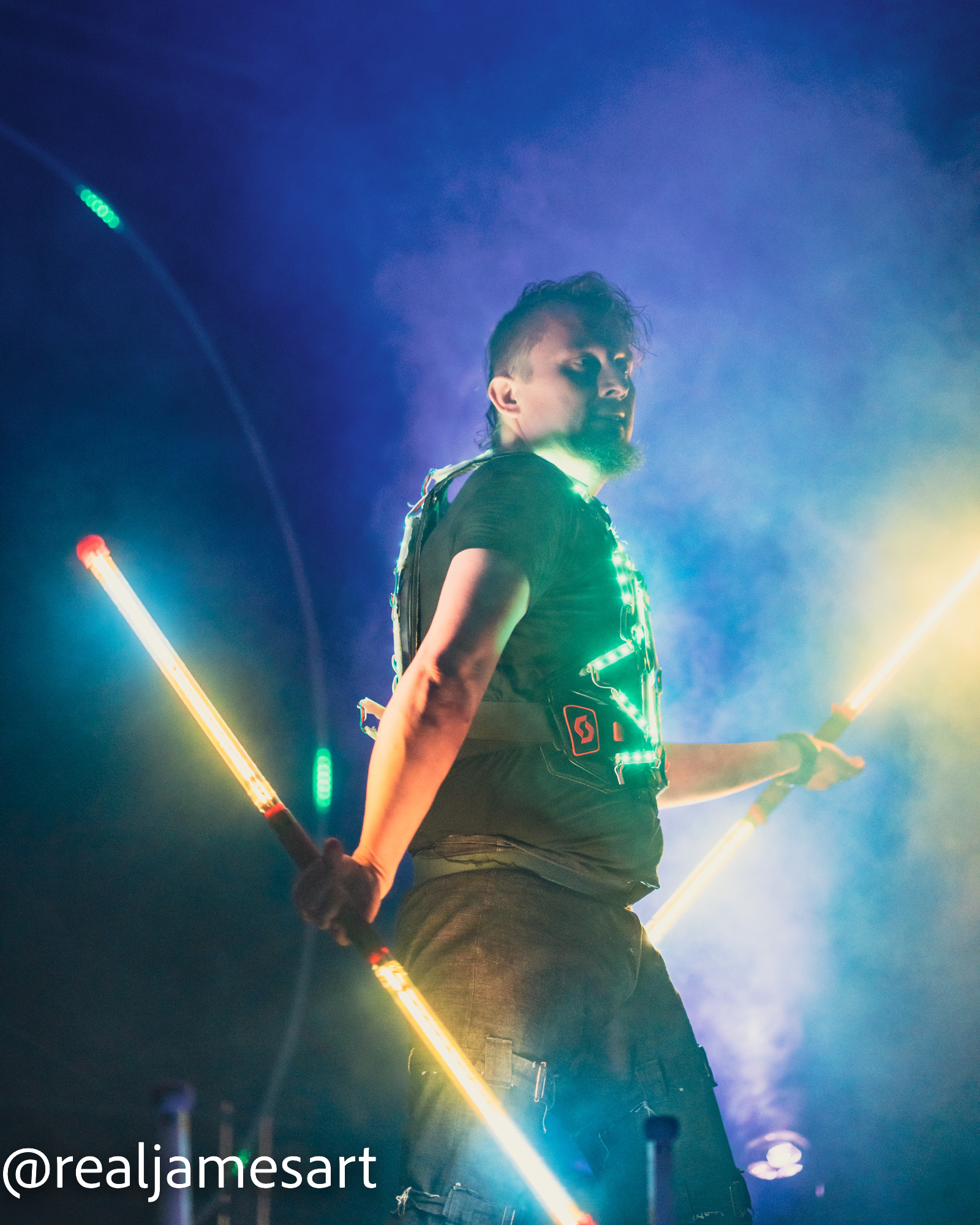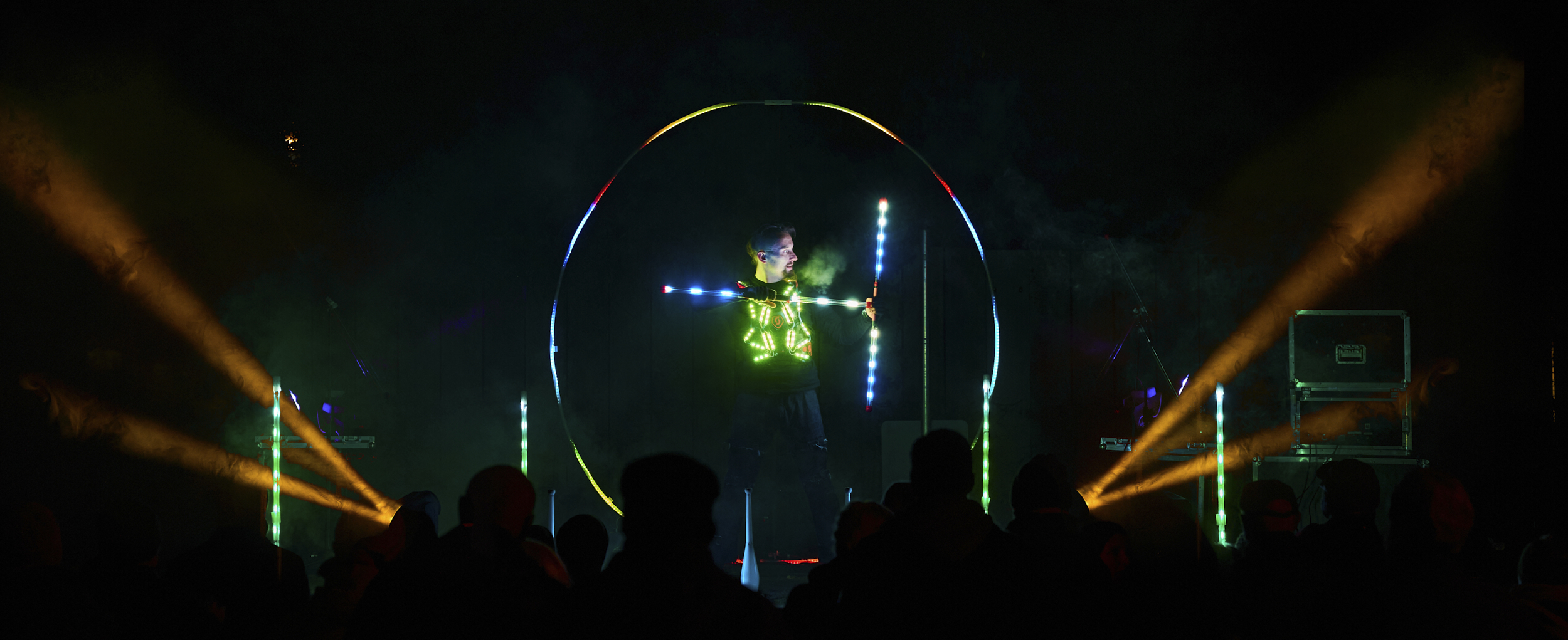Im Zentrum steht ein großer, leuchtender Lichtring, mit dem ich interagiere und der die Bühne in eine lebendige Lichtskulptur verwandelt. Getragen von elektronischer Musik und eingebettet in ein hochwertiges LED-Kostüm entfaltet sich so ein visuelles Erlebnis, das Technik und Emotion vereint.